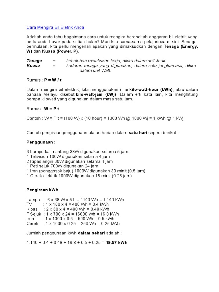 . Berikut dikongsikan kaedah pengiraan bil. Tapi untuk pengiraan kos elektrik kita tak boleh kira dalam masa sehari sebab julat ia berbeza-beza mengikut total penggunaan kWh. Jumlah bil elektrik adalah berdasarkan kepada bacaan meter.